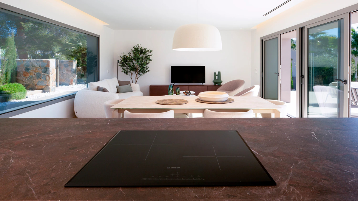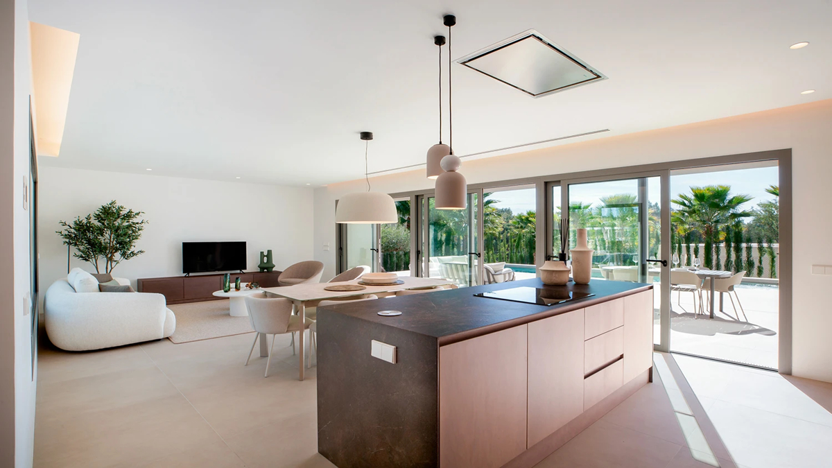 Die Immobilie verfügt über drei Schlafzimmer, darunter ein Hauptschlafzimmer mit en-suite Badezimmer, zwei weitere moderne Bäder sowie ein Gäste-WC. Die offene, voll ausgestattete Küche verbindet sich harmonisch mit dem hellen Wohn- und Essbereich.
